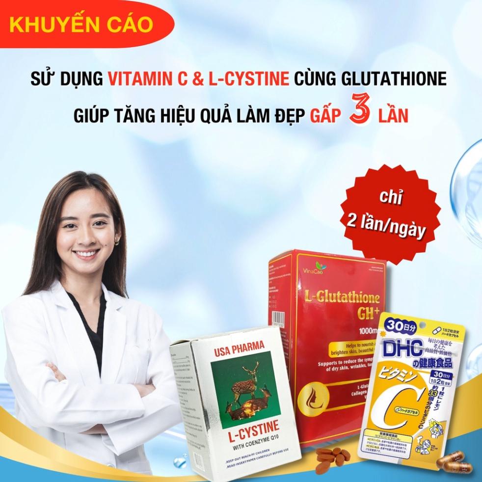 - Combo trắng da siêu cấp của Vinacao bao gồm các sản phẩm: L-Glutathione GH+ 1000mg, L-cystine USA Pharma và Vitamin C DHC thực sự là một lựa chọn hoàn hảo để giúp mọi người có được làn da như ý bởi: