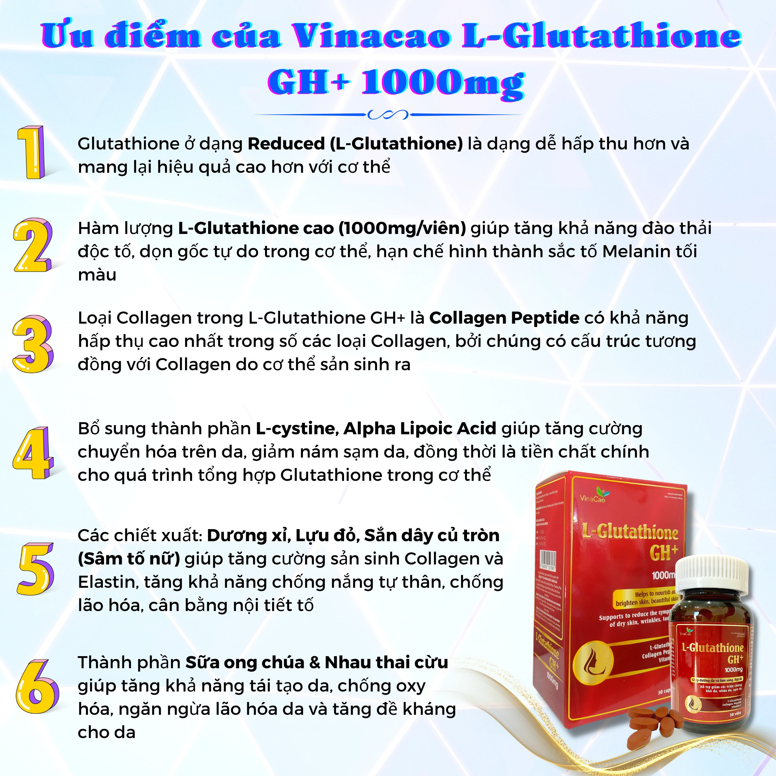 Như vậy, viên uống trắng da L-Glutathione GH+ 1000mg không chỉ mang lại cho bạn một làn da như mong muốn mà còn giúp bạn có một cơ thể khỏe mạnh từ bên trong.