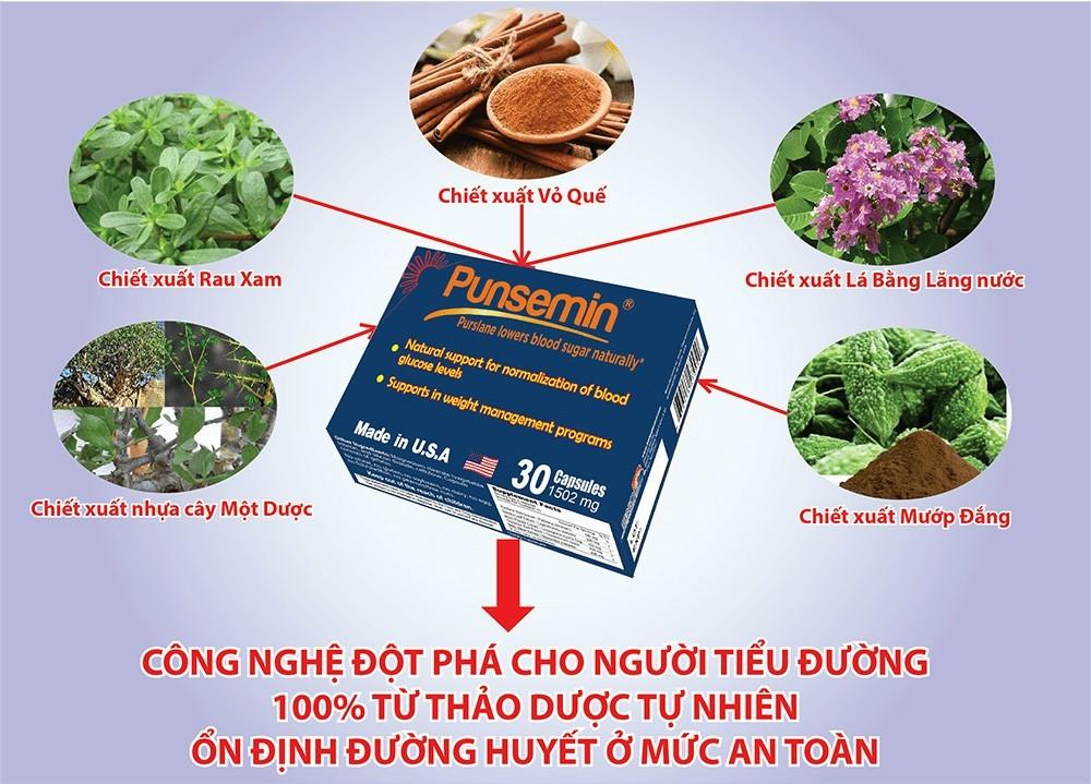 Punsemin gồm nhiều chiết xuất quý hiếm từ thảo dược thiên nhiên và được sản xuất trên dây chuyền hiện đại đạt chuẩn sẽ mang lại những tác dụng rõ rệt trong việc hạ và kiểm soát đường huyết, huyết áp, tim mạch,… giúp bệnh nhân đái tháo đường nhanh chóng phục hồi sức khoẻ.